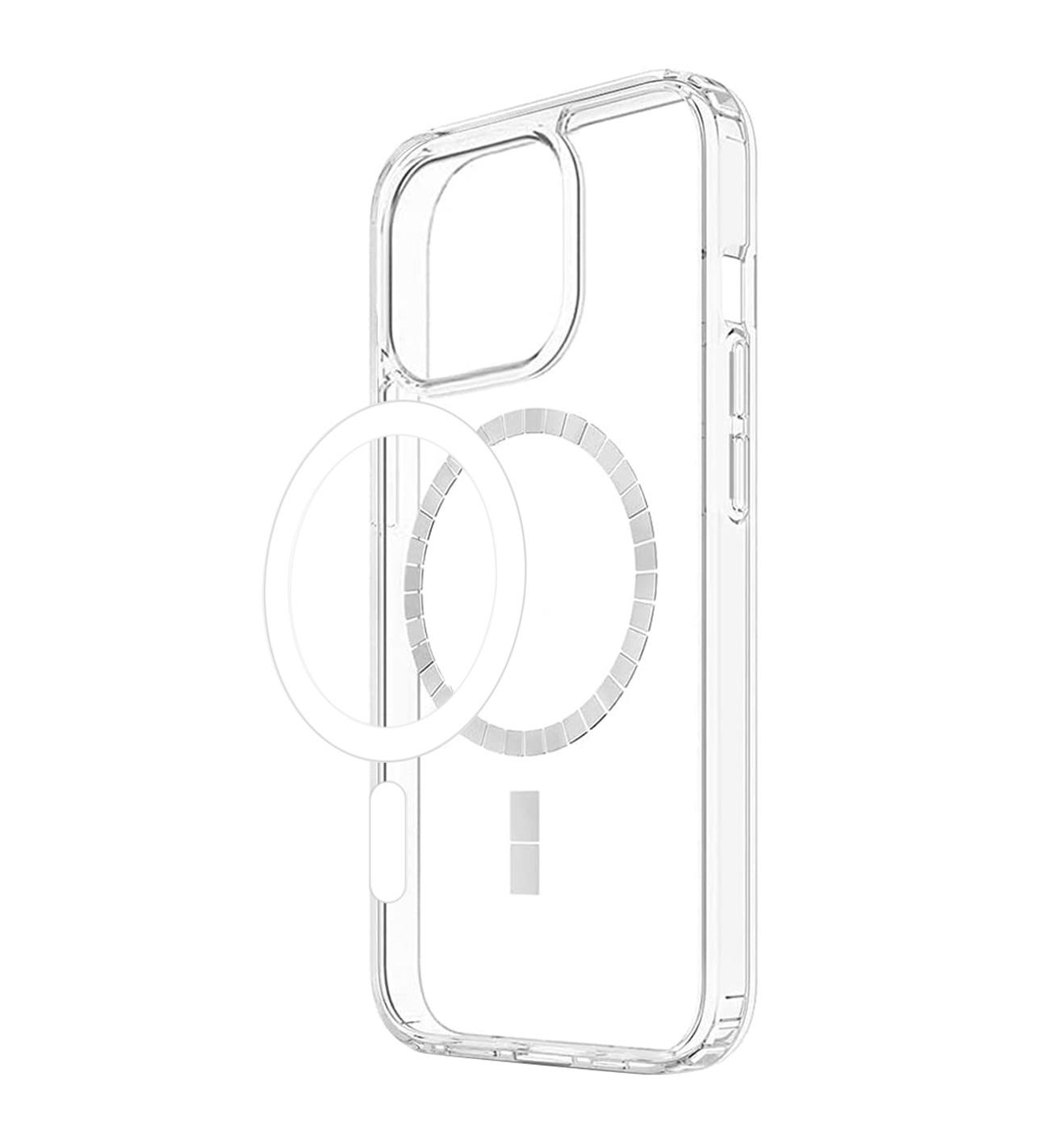 1. Pevná zadná polykarbonátová časť so zabudovaným MagSafe magnetom. 2. Pružný obvodový rám s presne vyrezanými otvormi pre konektory prekrýva aj tlačidlá. Spojením týchto dvoch materiálov kryt poskytuje kompletnú ochranu mobilu a zároveň umožňuje pripojenie MagSafe kompatibilného príslušenstva.